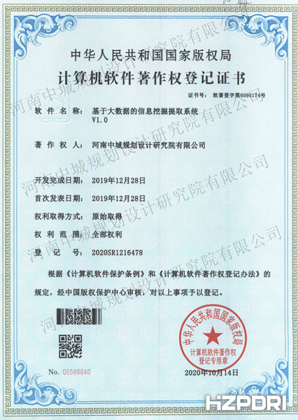 在此基础上,我公司立足于数据融合取得长足发展,在2019年底开发完成基于大数据的信息提取挖掘系统,并于2020年10月14日取得计算机软件著作权登记证书。此项成就是继2019年基于城市体检的中城调查及分析系统研发成功之后的新的突破。