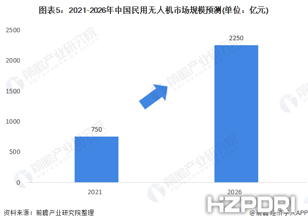 国内无人机规模化民用刚起步,而国家政策导向和地方政府的务实推进,正在大力推动我国无人机行业发展,催生出巨大的经济效益。2017年12月,《工业和信息化部关于促进和规范民用无人机制造业发展的指导意见》发布,明确了民用无人机产业的发展目标,到2025年,民用无人机产值达到1800亿元,年均增速25%以上,若以此增长率测算,2026年,我国民用无人机市场规模约达2250亿元。