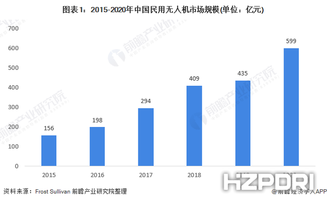Frost&Sullivan统计数据显示,2015-2019年我国民用无人机市场规模逐年上升,2019年中国民用无人机市场规模达435亿元人民币。2020年,我国民用无人机市场规模约达599亿元。