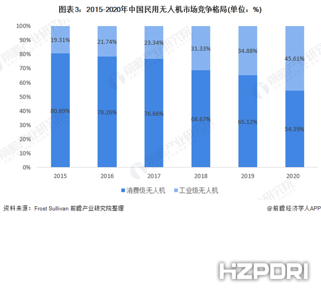 从整体竞争结构上看,Frost&Sullivan统计数据显示,2015年以来,我国工业级无人机在民用无人机市场份额占比逐年上升,2019年,在民用无人机市场中,工业级无人机市场份额占比达34.88%,至2020年,工业级无人机市场占比约达45.61%,未来市场占比仍将保持增长趋势。
