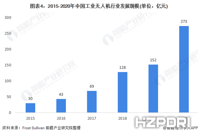 随着无人机技术的持续发展,无人机在工业领域的商业应用不断成熟,我国工业无人机市场规模正处于快速增长阶段。2019年,我国工业无人机市场规模达152亿元,2020年,我国工业无人机市场规模约达273亿元。