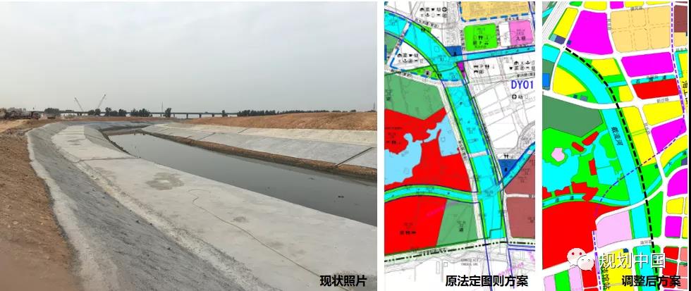 建筑风貌也一样,会有很多基于原来法定规划所确定的内容,实现不了的要怎么修改?从规划上讲,这条河围绕着会展中心,它是会展中心配套的景观很重要的一个特征。右边两张图可以看到,已经有了法定的规划,对这条河的价值我们又重新确定,土地利用功能在可能性的情况下进行调整,加大了河道旁边的绿化。法定规划改还是不改?为什么要改?理由是什么?包括道路系统,原定的道路系统有了真实项目之后,推衍一定会对原来路网的某些接口、断面、功能做调整,还会有新的项目进来。这些项目是在规划的预期之外的,出现之后还要对它带来的正面和负面效应进行研究。