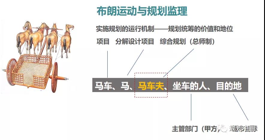 规划监理” 是以系统的视角去处理节点的问题。对“规划监理”的需求是肯定的。事务、事权、事例和事实之间的相关性缺乏制度层面的认知,相对于工程而言,“规划监理”在制度、机制、标准等方面是空白领域。各专业汇到一起,如果没有一个组织系统就会出现专业的思考形成不良运动,就是无规则运动。对于一个地区来讲,“马车夫”有可能是总师制很重要的策略,这四匹马相当于不同的专业,必须要有一套驾驭系统。
