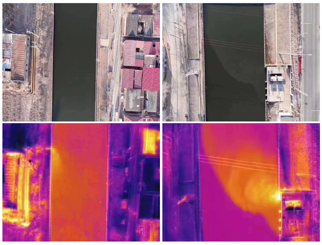 可见光相机观察不明显的排污口,通过热成像相机的画面,通过排污物与周围环境温差可清晰分辨定位。尤其夜间偷排,可见光无法观察的时候,热成像依旧有效。