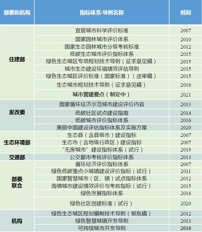 2007年以来,国内相关部委和机构已经制定和发布多项相关标准、评价体系、技术导则、建设指南、指标体系等,其中,部分尚在征求意见或试行过程中。