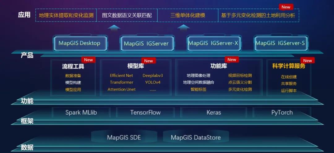 MapGIS 10.5 Pro对流程处理工具进行了数据增强和数据后处理方面的优化;在人工智能模型方面新增了Efficient Net、Deeplabv3等多种智能GIS模型,覆盖更多的应用场景;升级IGServer-S智能服务器产品,提升了智能GIS运维管理能力、智能分析能力及扩展开发能力。