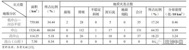 表1 喜德县地质灾害在地貌分区上的分布统计表