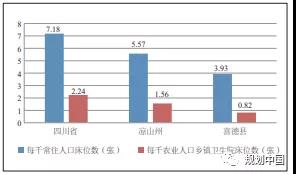 尽管喜德县近20年医疗服务和设施有长足改善(见表3),但与区域(四川省和凉山州)医疗服务供给能力仍然差距较大,呈现数量不足、质量不佳、空间获得不均衡的特征。以常住人口千人床位数和农业人口乡镇卫生院床位数为例,喜德县仅为四川全省水平的一半(图3)。从设施布局看,全县共有775张床位数,但县城综合医院占580张,乡镇卫生院仅160张。以人力资源配置看,喜德平均每村乡村医生和卫生院为1.81人,平均每千农业人口乡村医生和卫生员为1.57人[15],难以支撑镇村两级的有效医疗服务供给。