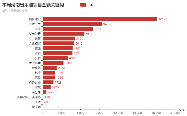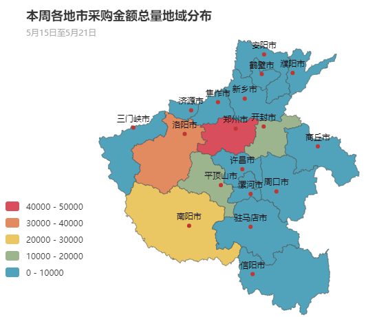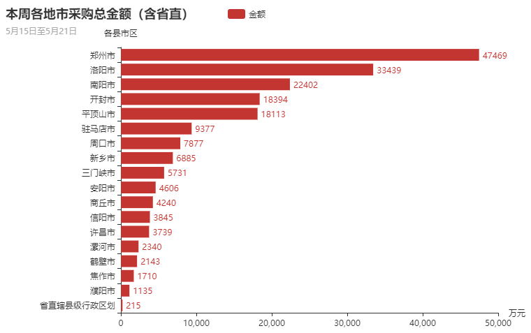从采购金额总量分布上来看,本周郑州市、洛阳市、南阳市、平顶山市、开封市政府采购市场需求占主导地位。