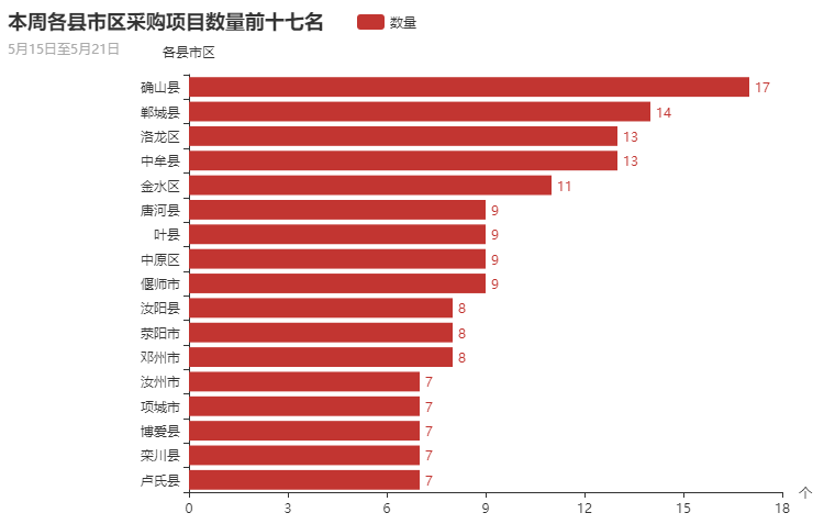 全省各县市区本周采购的项目为469个,占本周采购项目总量的77.64%。县市区排名前十七的依次为确山县、郸城县、洛龙区、中牟县、金水区、唐河县、叶县、中原区、偃师市、汝阳县、荥阳市、邓州市、汝州市、项城市、博爱县、栾川县、卢氏县。排名前十七的各县市区本周采购项目数量总量为163个,占全省各县市区采购总数量的34.75%。