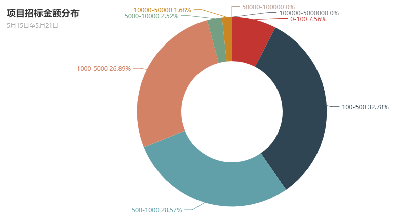 在本周的政府采购项目中,设计类前期项目36个,招标金额为1.31亿元,占比为5.28%;规划类前期项目为20个,招标金额为0.31亿元,占比为2.93%;监理类项目10个,招标金额为0.1亿元,占比为1.47%;施工类项目为13个,招标金额2.62亿元,占比为1.91%;设备采购类项目64个,招标金额1.63亿元,占比为9.38%;农村类项目23个,招标金额为1.86亿元,占比为3.37%,数据类项目4个,金额0.02亿元,占比0.59%。