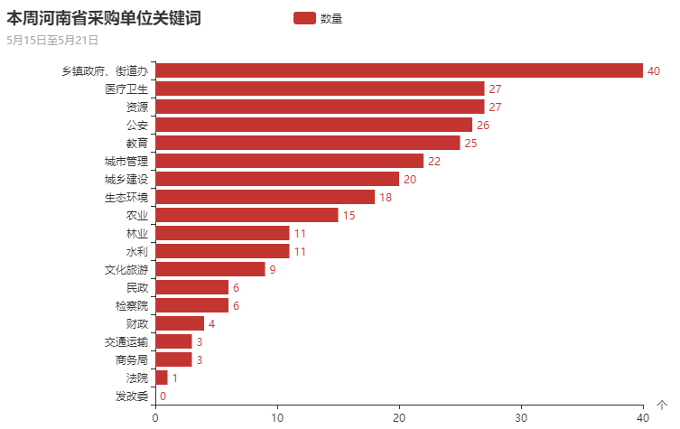根据本周政府采购关键词检索,本周采购主体排名前十的主要是乡镇政府和街道办、医疗卫生、资源、公安、教育、城市管理、城乡建设、生态环境、农业、林业等部门。以上部门采购项目总数量为231个,占本周政府采购项目总量比例84.3%。