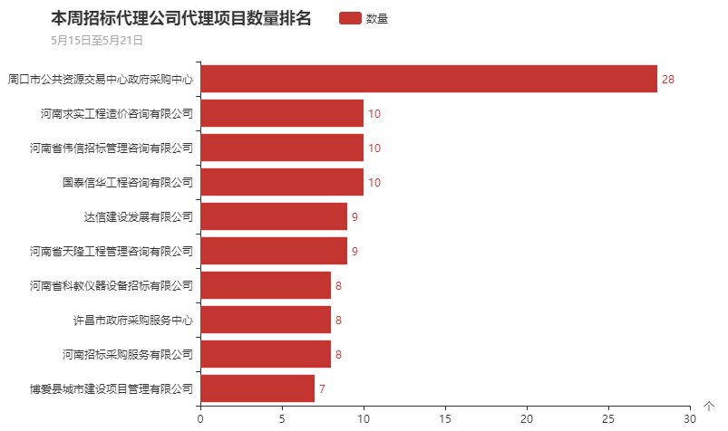 本周参与政府采购的招标代理机构为340家,本周代理项目数量最多的十家代理机构分别为博爱县城市建设项目管理有限公司、河南招标采购服务有限公司、许昌市政府采购服务中心、河南省科教仪器设备招标有限公司、河南省天隆工程管理咨询有限公司、达信建设发展有限公司、国泰信华工程咨询有限公司、河南省伟信招标管理咨询有限公司、河南求实工程造价咨询有限公司、周口市公共资源交易中心政府采购中心。其中周口市公共资源交易中心政府采购中心本周代理28个项目处于首位。