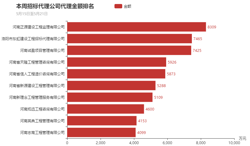 本周参与政府采购的招标代理机构为340家,本周代理项目金额最大的十家代理机构分别为河南志高工程管理有限公司、河南英典工程管理有限公司、河南拓远工程咨询有限公司、河南新理念工程管理服务有限公司、河南省新源建设工程管理有限公司、河南省信人工程造价咨询有限公司、河南省天隆工程管理咨询有限公司、河南诚盈项目管理有限公司、洛阳市东虹建设工程招标代理有限公司、河南正源建设工程监理有限公司。其中河南正源建设工程监理有限公司本周代理金额为0.83亿元处于首位。