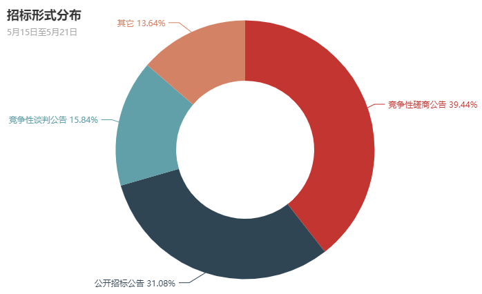 本周数据表明,河南政府采购市场中,公开招标、竞争性谈判和竞争性磋商形式在政府采购中依然占主体地位。
