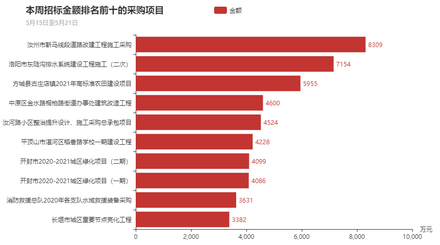 在本周政府采购的682个项目中,招标金额最大的十大项目依次为汝州市农村公路精品线路靳马线(大峪高速出口—G207、山汝线—侯饭线)段道路改建工程施工采购、洛阳市住房和城乡建设局洛阳市东陡沟(机场路~邙岭大道)排水系统建设工程施工(二次)、方城县农业综合服务中心方城县古庄店镇2021年高标准农田建设项目、中原区金水路(嵩山路—秦岭路)桐柏路街道办事处建筑改造工程、汝河路街道办事处老旧小区(万福花园、工商局家属院、汝河小区)整治提升设计、施工采购总承包项目、平顶山市湛河区教育体育局平顶山市湛河区稻香路学校一期建设工程、开封市2020-2021城区绿化项目(二期)--南城墙(环城公园一期、三期、五期)及滨河路、开封市2020-2021城区绿化项目(一期)--南城墙(环城公园一期、三期、五期)及滨河路、河南省消防救援总队2020年各支队水域救援装备采购项目、长垣市住房和城乡建设局长垣市城区重要节点亮化工程。该十大项目招标总金额为4.99亿元,占本周项目招标总金额的23.12%,其中排名第一的是汝州市农村公路精品线路靳马线(大峪高速出口—G207、山汝线—侯饭线)段道路改建工程施工采购,招标金额为0.83亿元,占本周项目招标总金额的3.84%。