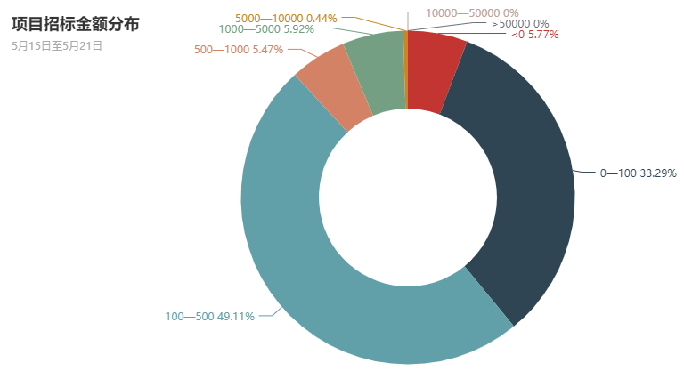 3、本周招标金额最大的十大项目中,主要集中于交通、人居环境改善、教育等领域;500万元以下的政府采购项目有596个,占同期采购项目总量的87.39%。