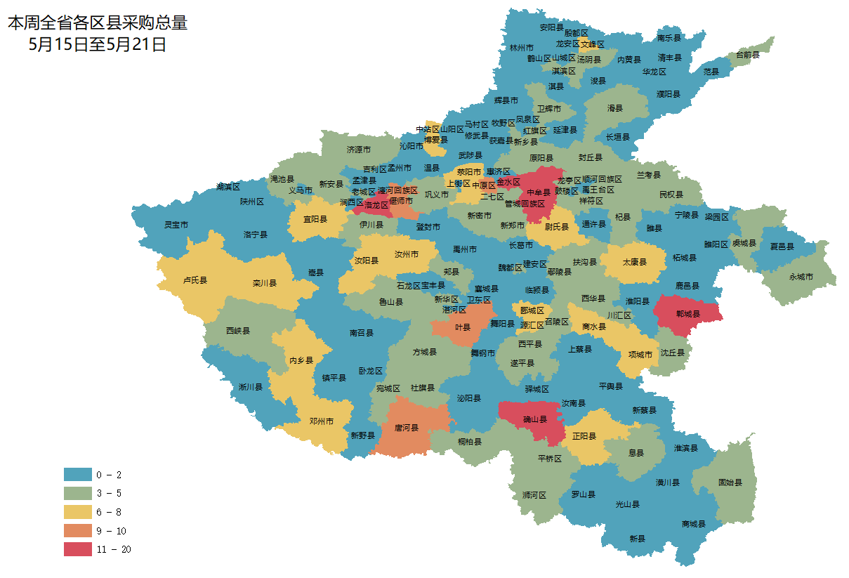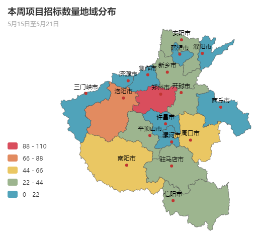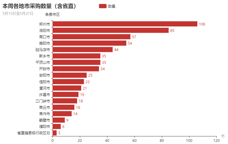 从采购项目总量分布上来看,本周郑州市、洛阳市、驻马店市、南阳市、周口市采购需求占主导地位。