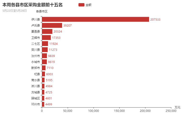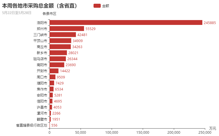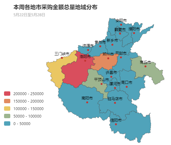 从采购金额总量分布上来看,本周郑州市、洛阳市、三门峡市、平顶山市、商丘市政府采购市场需求占主导地位。