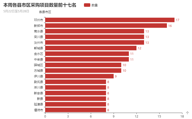 全省各县市区本周采购的项目为537个,占本周采购项目总量的79.55%。县市区排名前十七的依次为偃师市、延津县、新县、新安县、淅川县、尉氏县、伊川县、方城县、驿城区、中牟县、金水区、郸城县、汝州市、栾川县、商水县、新郑市、邓州市。排名前十七的各县市区本周采购项目数量总量为183个,占全省各县市区采购总数量的34.07%。