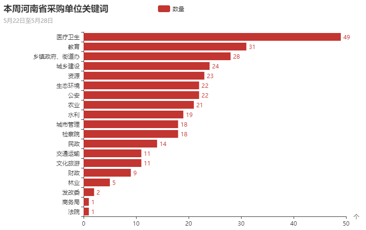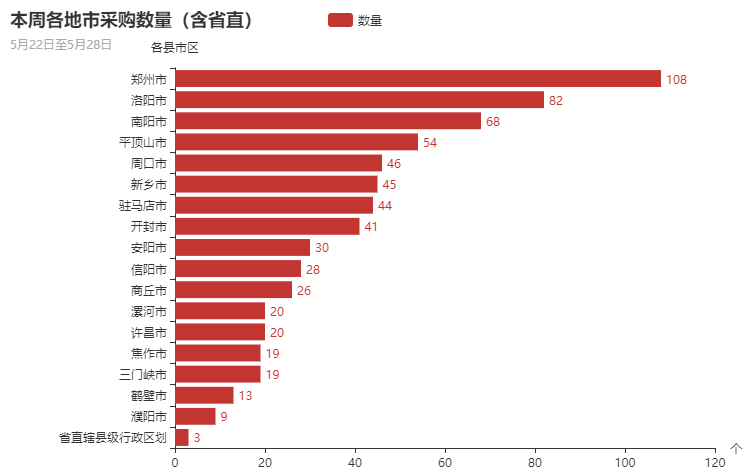 在本周的政府采购项目中,18个地市及省直排名中,其中郑州市、洛阳市、平顶山市、南阳市、周口市发布政府采购项目数量排在前五,五地市政府采购项目数量达到358个,占全省总量的53.03%。
