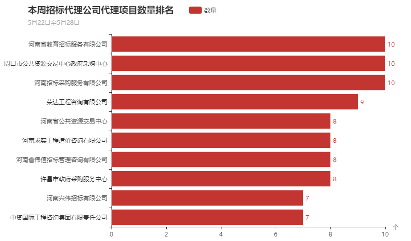 7、本周招标代理领域竞争较为激烈,但河南省教育招标服务有限公司、河南大明建设工程管理有限公司本周较为活跃并具有相对市场优势。