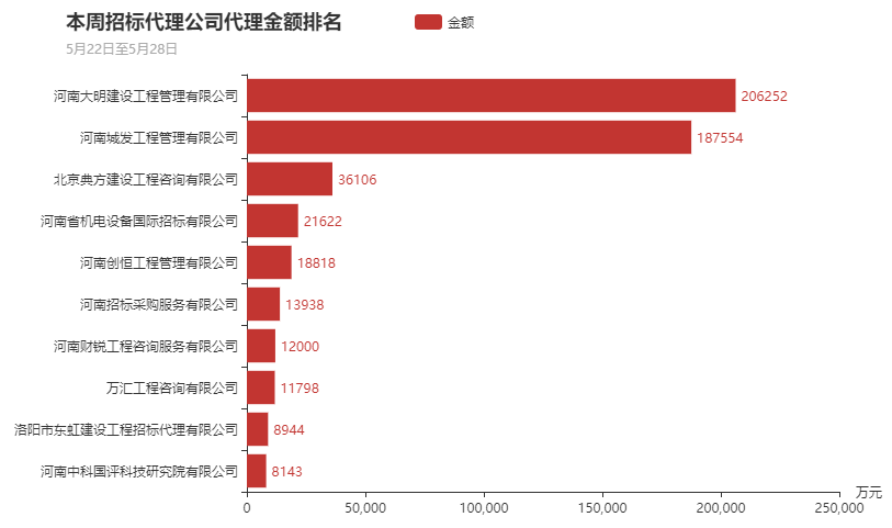 本周参与政府采购的招标代理机构为386家,本周代理项目金额最大的十家代理机构分别为河南中科国评科技研究院有限公司、洛阳市东虹建设工程招标代理有限公司、万汇工程咨询有限公司、河南财锐工程咨询服务有限公司、河南招标采购服务有限公司、河南创恒工程管理有限公司、河南省机电设备国际招标有限公司、北京典方建设工程咨询有限公司、河南城发工程管理有限公司、河南大明建设工程管理有限公司。其中河南大明建设工程管理有限公司本周代理金额为20.6亿元处于首位。