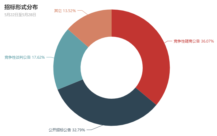 本周数据表明,河南政府采购市场中,公开招标、竞争性谈判和竞争性磋商形式在政府采购中依然占主体地位。