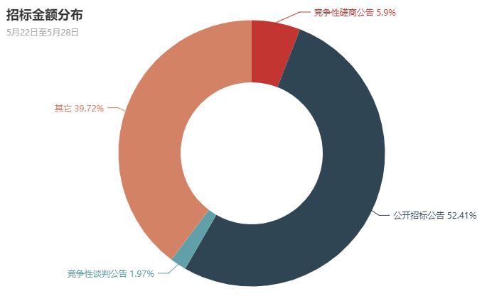 本周政府采购项目中,以公开招标形式采购项目总金额为38.9亿元,占比52.41%;以竞争性谈判形式采购项目总金额为1.46亿元,占比1.97%;以竞争性磋商形式采购项目总金额为4.38亿元,占比5.9%;以其它形式招标(含询价、资格预审)采购项目总金额为29.5亿元,占比为39.72%。根据招标金额统计,采用公开招标形式的项目平均采购金额为1623万元,采用竞争性谈判和竞争性磋商形式的项目平均采购金额为113万元和166万元。