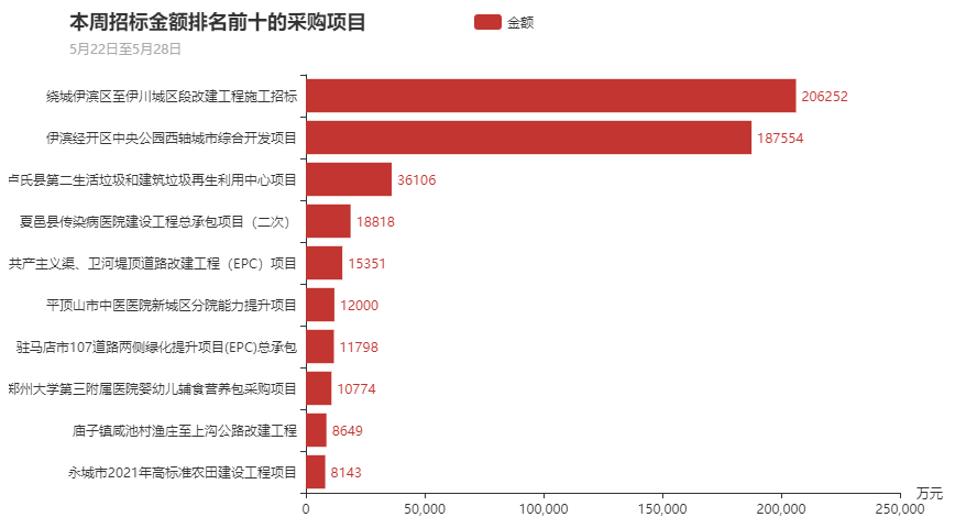 在本周政府采购的732个项目中,招标金额最大的十大项目依次为永城市2021年高标准农田建设工程项目、庙子镇咸池村渔庄至上沟公路改建工程、郑州大学第三附属医院(河南省妇幼保健院)婴幼儿辅食营养包采购项目、驻马店市107道路(汝河大道—新阳高速南引线)两侧绿化提升项目(EPC)总承包、平顶山市中医医院新城区分院能力提升项目、卫辉市共产主义渠、卫河堤顶道路改建工程(EPC)项目、夏邑县传染病医院建设工程总承包项目(二次)、卢氏县第二生活垃圾处理厂和建筑垃圾处理再生利用中心项目(二次)、伊滨经开区(示范区)中央公园西轴城市综合开发项目、伊川县公路事业发展中心G208二淅线洛阳绕城伊滨区至伊川城区段改建工程施工招标。该十大项目招标总金额为51.5亿元,占本周项目招标总金额的69.32%,其中排名第一的是济源市交通运输局沿太行山高速公路西延,招标金额为20.6亿元,占本周项目招标总金额的27.74%。