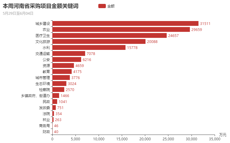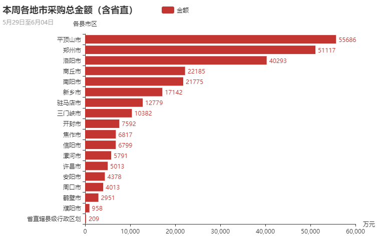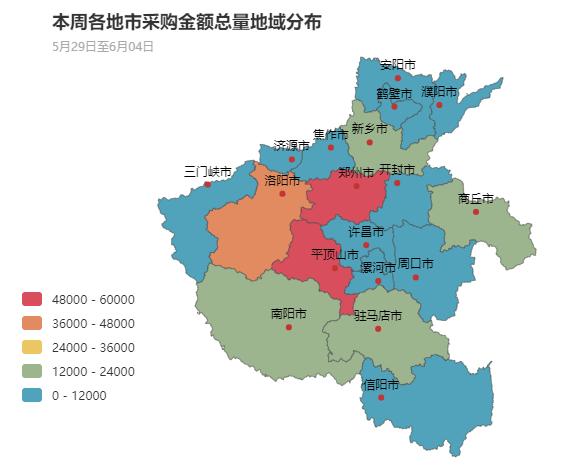 从采购金额总量分布上来看,本周郑州市、洛阳市、南阳市、平顶山市、商丘市政府采购市场需求占主导地位。