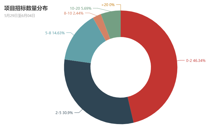 全省各县市区本周采购的项目为462个,其中有57个县市区采购项目小于2个,占全部采购县市区的46.34%;有38个县市区采购项目在2至5个,占全部采购县市区的30.9%;有18个县市区采购项目在5至8个,占全部采购县市区的14.63%;有3个县市区采购项目在8至10个,占全部采购县市区的2.44%;有7个县市区采购项目大于10个,占全部采购县市区的5.69%。