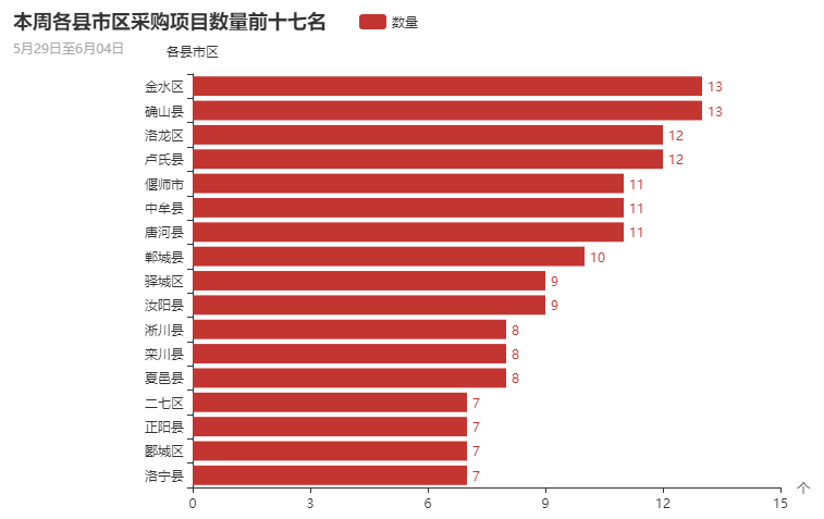全省各县市区本周采购的项目为462个,占本周采购项目总量的74.87%。县市区排名前十七的依次为洛宁县、郾城区、正阳县、二七区、夏邑县、栾川县、淅川县、汝阳县、驿城区、郸城县、唐河县、中牟县、偃师市、卢氏县、洛龙区、确山县、金水区。排名前十七的各县市区本周采购项目数量总量为163个,占全省各县市区采购总数量的35.28%。