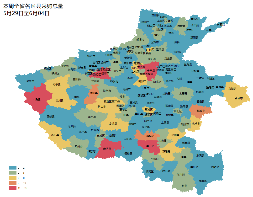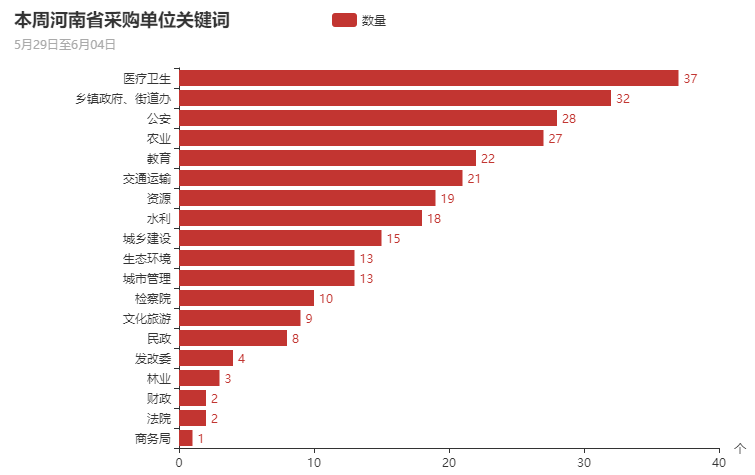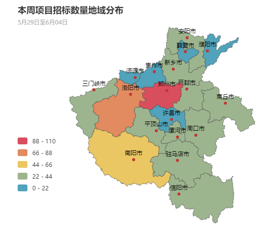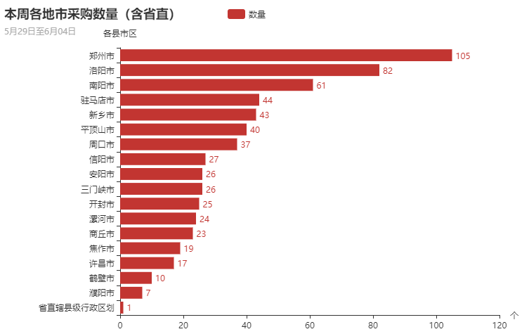 从采购项目总量分布上来看,本周郑州市、洛阳市、新乡市、南阳市、驻马店市采购需求占主导地位。
