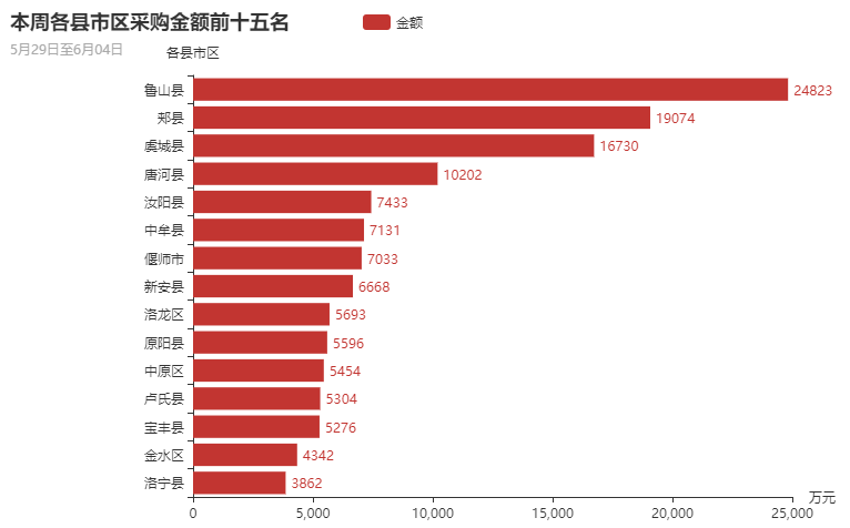 全省各县市区层面政府采购的总金额为22.19亿元。县市区排名前十五的依次为洛宁县、金水区、宝丰县、卢氏县、中原区、原阳县、洛龙区、新安县、偃师市、中牟县、汝阳县、唐河县、虞城县、郏县、鲁山县。排名前十五的各县市区本周采购项目总额达到13.46亿元,占全省各县市区采购金额的60.6%。