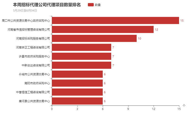 本周参与政府采购的招标代理机构为368家,本周代理项目数量最多的十家代理机构分别为唐河县公共资源交易中心、中誉恒信工程咨询有限公司、南阳市政府采购中心、永城市公共资源交易中心、中新创达咨询有限公司、许昌市政府采购服务中心、河南宇正工程咨询有限公司、河南招标采购服务有限公司、河南省伟信招标管理咨询有限公司、周口市公共资源交易中心政府采购中心。其中周口市公共资源交易中心政府采购中心本周代理15个项目处于首位。