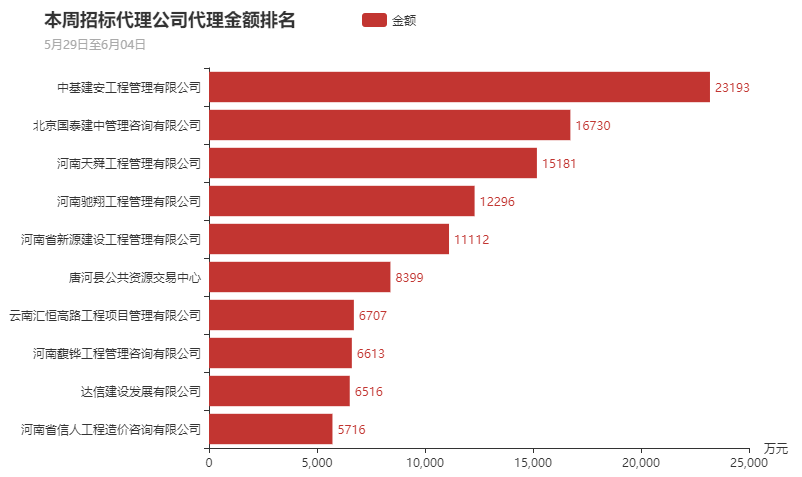 本周参与政府采购的招标代理机构为368家,本周代理项目金额最大的十家代理机构分别为河南省信人工程造价咨询有限公司、达信建设发展有限公司、河南馥铧工程管理咨询有限公司、云南汇恒高路工程项目管理有限公司、唐河县公共资源交易中心、河南省新源建设工程管理有限公司、河南驰翔工程管理有限公司、河南天舜工程管理有限公司、北京国泰建中管理咨询有限公司、中基建安工程管理有限公司。其中中基建安工程管理有限公司本周代理金额为2.31亿元处于首位。