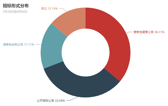 本周数据表明,河南政府采购市场中,公开招标、竞争性谈判和竞争性磋商形式在政府采购中依然占主体地位。