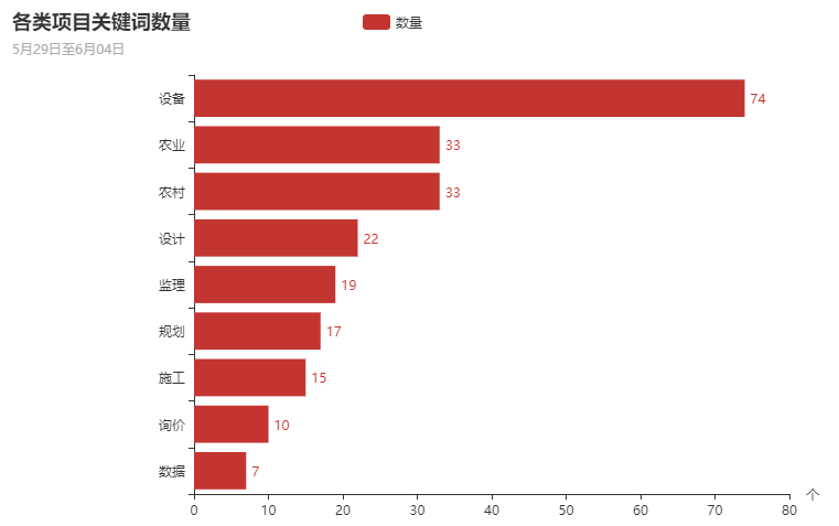 在本周的政府采购项目中,设备、农业类项目占比最大,其次为农村类、施工类、监理类、设计类、规划类。数据表明,农业、设备类项目已经成为政府采购的主要方向。