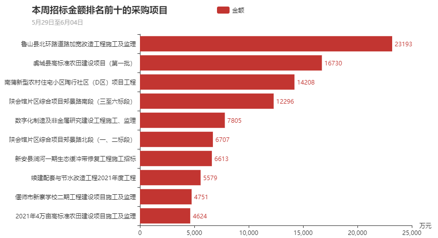 在本周政府采购的684个项目中,招标金额最大的十大项目依次为宝丰县2021年4万亩高标准农田建设项目施工及监理、偃师市新寨学校二期工程建设项目施工及监理、三刘寨引黄中型灌区续建配套与节水改造工程2021年度工程、新安县涧河一期生态缓冲带修复工程施工招标、郏县山陕会馆片区综合项目郏景路北段(一、二标段)、长垣市航天数字化制造及非金属研究项目厂区建设工程施工、监理、郏县山陕、馆片区综合项目郏景路南段(三至六标段)、南蒲新型农村住宅小区陶行社区(D区)项目工程、虞城县高标准农田建设项目(第一批)、鲁山县北环路(三里河转盘至梁张路)道路加宽改造工程施工及监理。该十大项目招标总金额为10.2亿元,占本周项目招标总金额的32.98%,其中排名第一的是济源市交通运输局沿太行山高速公路西延,招标金额为2.31亿元,占本周项目招标总金额的7.46%。