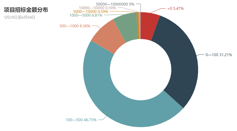 在招标的684个项目中,招标金额披露的项目有676个。其中招标金额在小于0万元之间的项目有37个招标金额在0-100万元之间的项目有209个,招标金额在100-500万元之间的项目有316个,招标金额在500-1000万元之间的项目有58个,招标金额在1000-5000万元之间的项目有46个,招标金额在5000-10000万元之间的项目有4个,招标金额在大于10000万元之间的项目有4个。统计数据显示,500万元以下的政府采购项目有564个,占同期采购项目总量的82.16%。