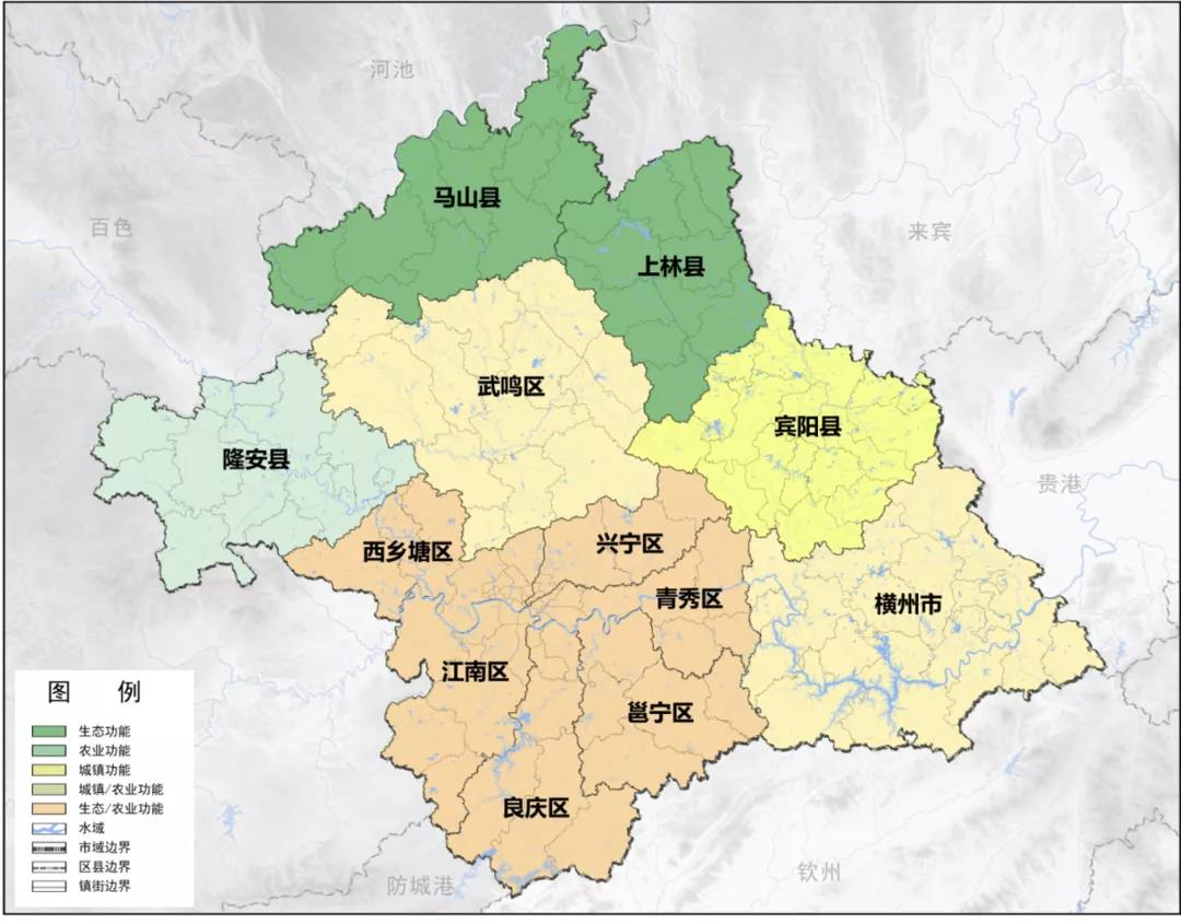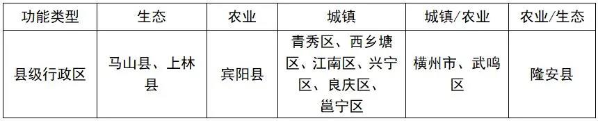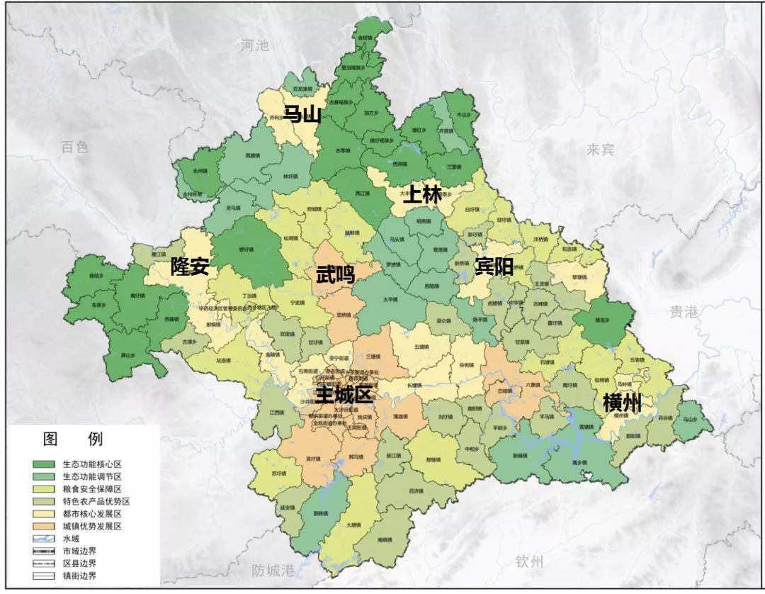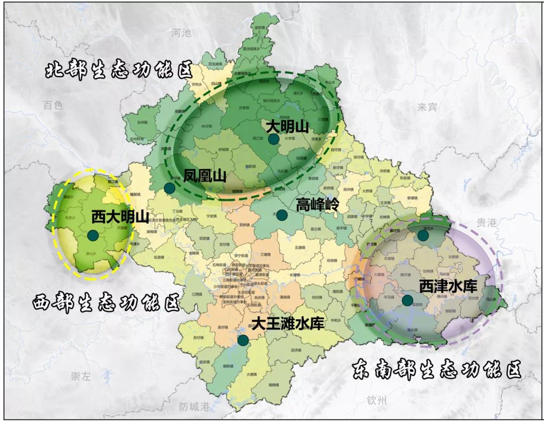 重点生态功能区整体呈“多组团”式空间格局,主要分布在市域北部、西部和东南部。核心区域为大明山、西大明山山脉连接呈现的倒“U”型环绕区域。