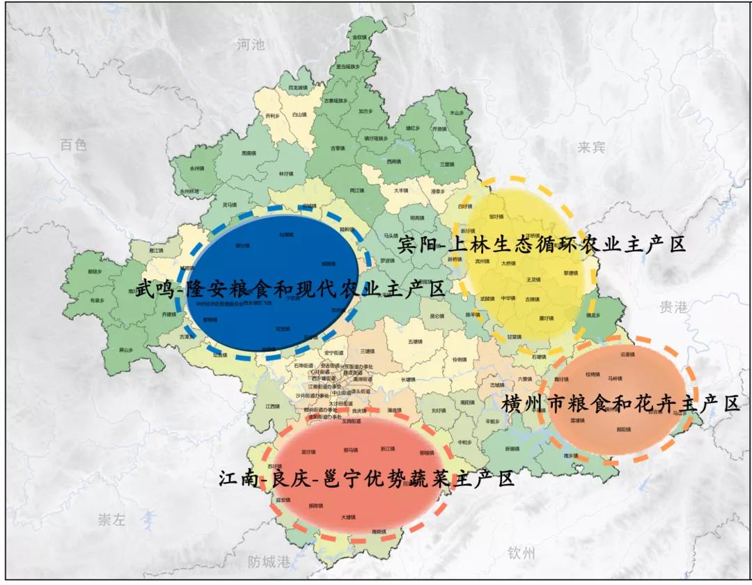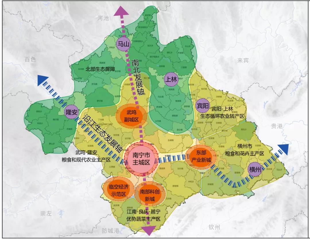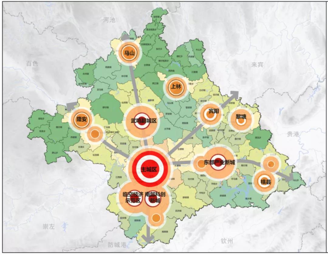城市化发展区整体形成“一核多点”的开发总体格局。以主城区为核心,武鸣副城区、临空经济示范区、南部科创新城、东部产业新城以及各县级发展中心为经济增长点。