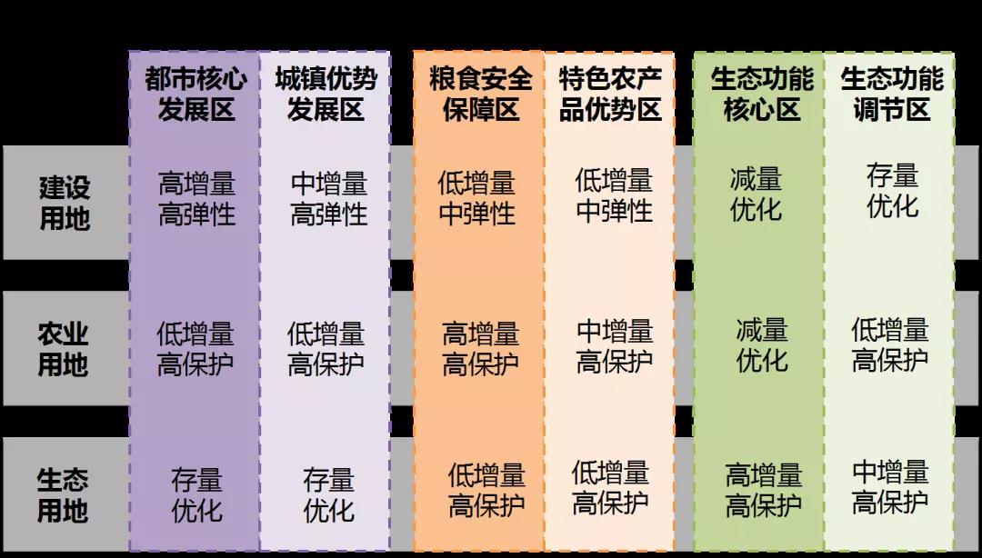 都市核心发展区和城镇优势发展区鼓励建设用地弹性管理,保持增量发展。粮食安全保障区和农产品优势区以低增量的形式提高建设用地规模。生态功能核心区应以减少建设用地使用量并优化使用效率,生态功能核心区应鼓励存量用地再开发。