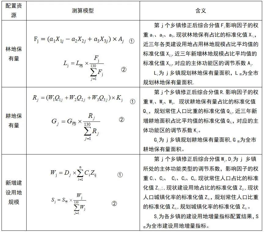根据主体功能定位,设置生态保护类、粮食安全类、开发建设类约束性指标。其中,土地资源核心指标选取建设用地总量、耕地保有量、林地保有量。结合主体功能区现状开发特征,将主体功能区作为重要因素进行优化配置,构建用地配置测算模型,计算得到处于三类空间和六类空间的分解指标,形成分解区间,实现对各乡镇用地规模的动态调整。