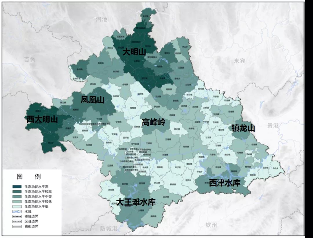 生态功能水平高的镇(乡、街道办)级行政区有11个,面积占全市11.14%;较高、中等等级有27个,面积占全市30.90%;较低、低等级有92个,面积占比高达87.96%。生态功能水平总体呈现“四周高、中间低”的空间格局,生态功能水平高的地区主要分布在重要的山脉、自然保护区、一级水源保护地等地,如大明山、西大明山、西津水库等。