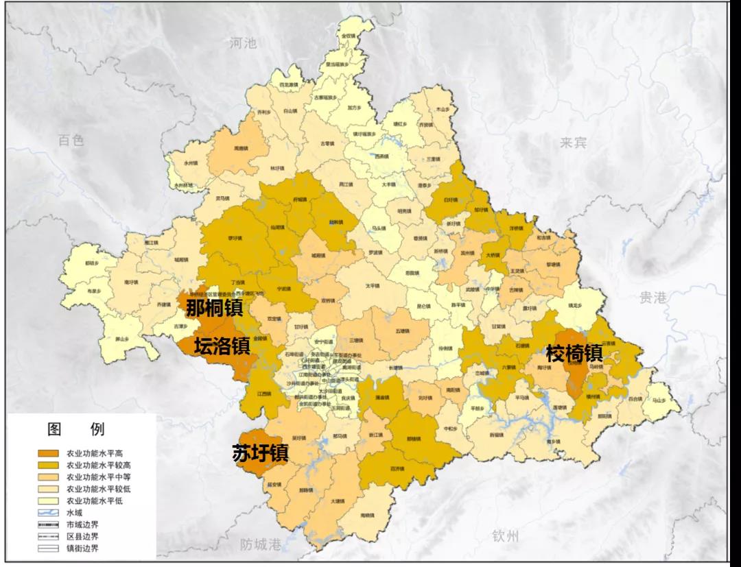 农业功能水平高的镇(乡、街道办)级行政区有4个,面积占全市3.55%;较高、中等等级有39个,数量占全市30%;较低、低等级有87个,数量占比高达66.92%。农业功能水平整体呈现“西东高、中部低”的空间格局,农业功能水平高的地区主要分布在具有特色农产品的地区,如中华茉莉花产业核心示范区、优质稻产业核心示范区等。