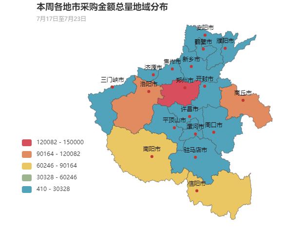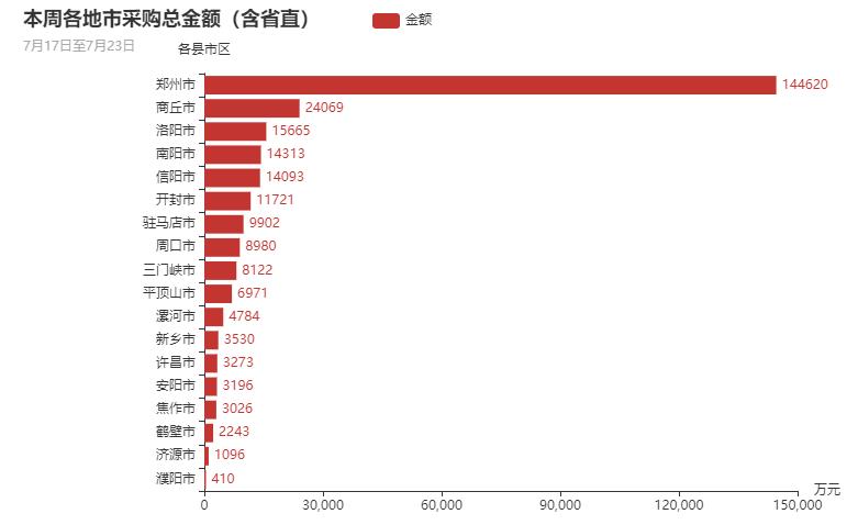 从采购金额总量分布上来看,本周郑州市、商丘市、洛阳市、南阳市、信阳市政府采购市场需求占主导地位。
