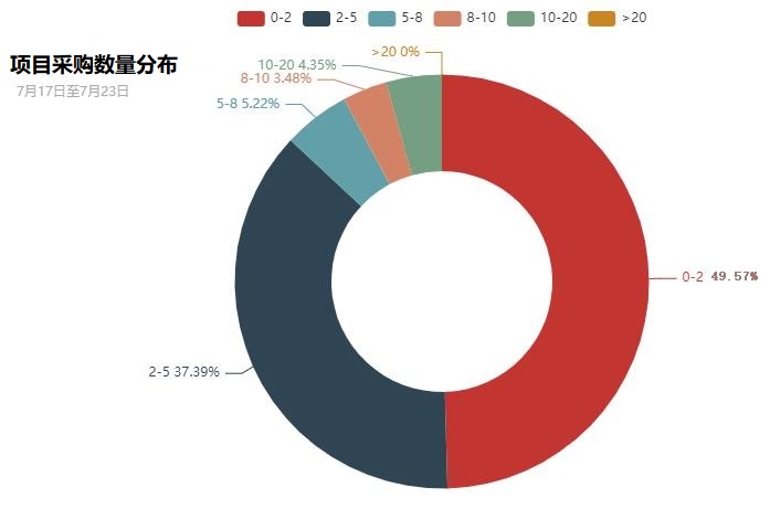 全省各县市区本周采购的项目为395个,其中有57个县市区采购项目小于2个,占全部采购县市区的49.57%;有43个县市区采购项目在2至5个,占全部采购县市区的37.39%;有6个县市区采购项目在5至8个,占全部采购县市区的5.22%;有4个县市区采购项目在8至10个,占全部采购县市区的3.48%;有5个县市区采购项目大于10个,占全部采购县市区的4.35%。