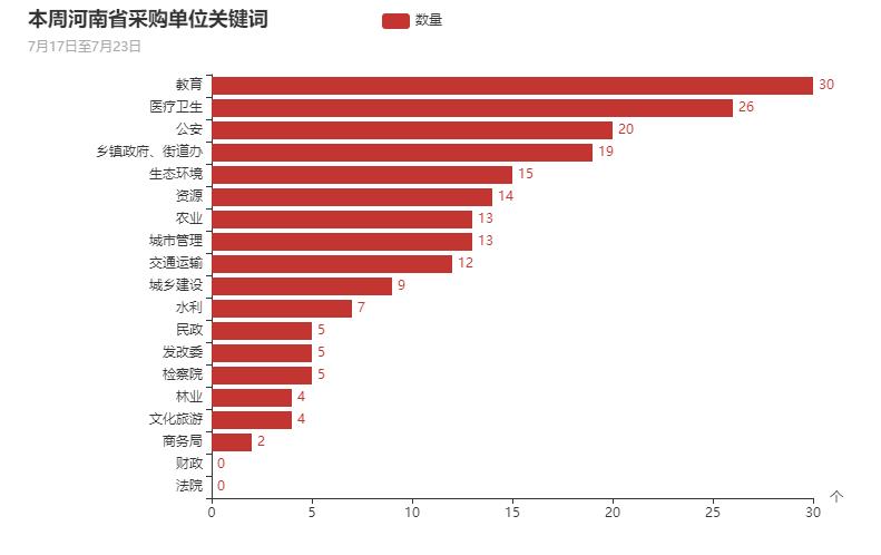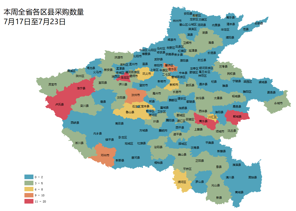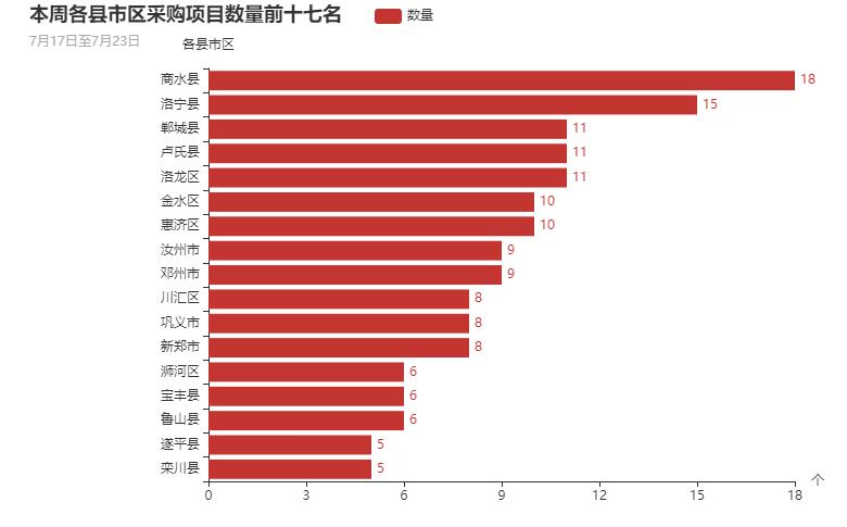 全省各县市区本周采购的项目为395个,占本周采购项目总量的73.83%。县市区排名前十七的依次为栾川县、遂平县、鲁山县、宝丰县、浉河区、新郑市、巩义市、川汇区、邓州市、汝州市、惠济区、金水区、洛龙区、卢氏县、郸城县、洛宁县、商水县。排名前十七的各县市区本周采购项目数量总量为156个,占全省各县市区采购总数量的39.49%。